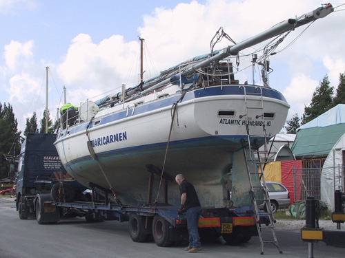 Preston Marina, on the Ribble estuary in Lancashire, offers a first class refit yard for big yachts based in the Isle of Man. Here MARICARMEN, a Morgan Out Island 41 ketch, originally from Atlantic Highlands in Raritan Bay, New Jersey, USA, arrives at Preston by road from Padstow in Cornwall. Her 18.9m main mast was unstepped and stowed on deck by a rigger from Sealand Boat Deliveries.