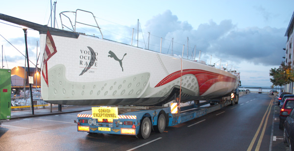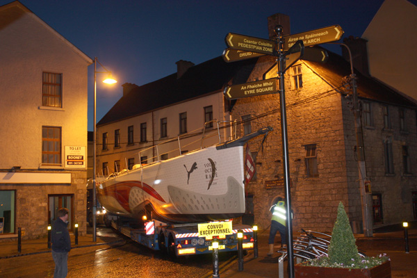Shoehorning the white monster's 5m wide hull round Eyre Square in the heart of the mediaeval city was planned by Craig Stanbury at Peters & May in Southampton. Drivers Phil Taylor and Chris Bugler from Transboat Limited hauled the monster from Gosport to Galway Pier in May. Chris Bugler had to negotiate the city centre with WHITE MOSTRO's 32m long mast before she could be rigged and plinthed for the festivities. WHITE MOSTRO later sailed from Galway to Sweden following the next leg of the world's premier yacht race that started in Alicante, visited Cape Town, Kochi, Singapore, Qingdao, Rio de Janeiro, Boston, Galway, Gothenburg, Stockholm to finish in St Petersburg.
